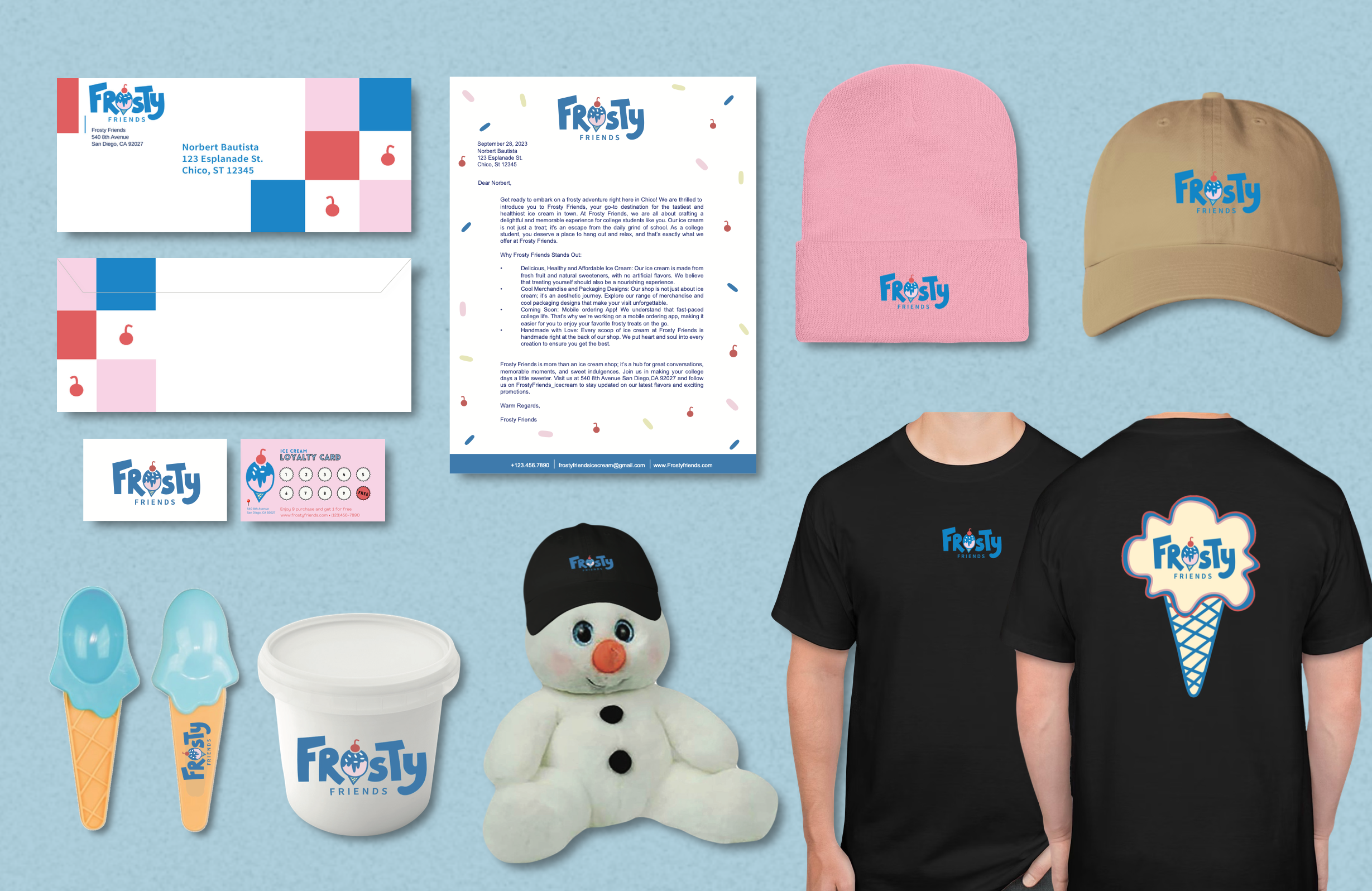 My solution involved crafting a cohesive brand identity and logo for Frosty Friends, the brainchild of my vision to revolutionize the ice cream experience. Emphasizing our core values of healthier indulgence and affordability for college students, the logo and branding elements reflect Frosty Friends commitment to natural ingredients, customizable options, and fostering a sense of community. By designing vibrant packaging and signage, implementing online and app ordering options, and offering student discounts and testimonials, Frosty Friends becomes the go-to destination for guilt-free sweet cravings and social gatherings.